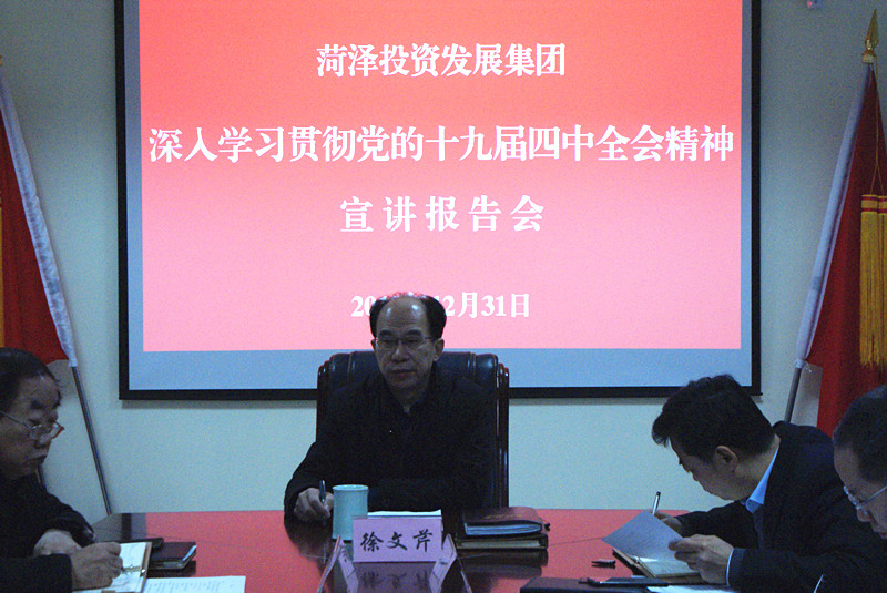 2019年12月31日,菏澤投資發(fā)展集團(tuán)有限公司深入學(xué)習(xí)貫徹黨的十九屆四中全會精神宣講報告會在公司第二會議室舉行。公司黨委書記、董事長徐文芹主持會議并作宣講報告。公司合署辦公機(jī)構(gòu)全體人員,各企業(yè)主要負(fù)責(zé)同志參加會議。