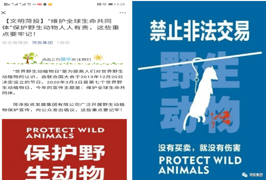 3月3日是第七個(gè)世界野生動(dòng)植物日,今年的宣傳主題是:維護(hù)全球生命共同體。菏澤投資發(fā)展集團(tuán)有限公司廣泛開展野生動(dòng)植物保護(hù)宣傳,并通過公司微信公眾號(hào)向廣大市民發(fā)出“保護(hù)野生動(dòng)植物,維護(hù)生態(tài)平衡,拒食野生動(dòng)物,守護(hù)綠色地球”的倡議,呼吁善待野生動(dòng)物,革除濫食野生動(dòng)物陋習(xí),建設(shè)人與野生動(dòng)植物和諧共生的美好家園,維護(hù)全球生命共同體。