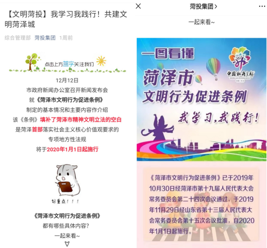 3月5日是全國第57個(gè)“學(xué)雷鋒紀(jì)念日”,菏投集團(tuán)組織8名志愿者利用下午上班前的時(shí)間,分成2個(gè)小組在公司辦公區(qū)域向各寫字樓辦公人員和來訪人員發(fā)放《學(xué)習(xí)雷鋒精神和志愿服務(wù)精神倡議書》《雷鋒同志的先進(jìn)事跡》,面對(duì)面耐心細(xì)致地向群眾宣傳雷鋒精神,講解雷鋒先進(jìn)事跡,發(fā)動(dòng)群眾爭做雷鋒精神的倡導(dǎo)者、踐行者、推動(dòng)者。同時(shí)以本次活動(dòng)為契機(jī),廣泛宣傳《菏澤市文明行為促進(jìn)條例》,弘揚(yáng)社會(huì)主義核心價(jià)值觀。3月9日,公司又廣泛動(dòng)員廣大干部員工認(rèn)真學(xué)習(xí)《菏澤市文明行為促進(jìn)條例》,并在公司公眾號(hào)以圖文形式進(jìn)行轉(zhuǎn)載,積極引導(dǎo)員工樹立文明意識(shí),提升文明素質(zhì)。