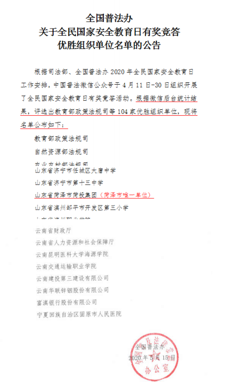 5月19日,全國普法辦公布了全民國家安全教育日有獎(jiǎng)競答活動(dòng)優(yōu)勝組織單位名單,教育部政策法規(guī)司等104家單位被評為優(yōu)勝組織單位,菏投集團(tuán)名列其中,為菏澤市唯一優(yōu)勝組織單位。