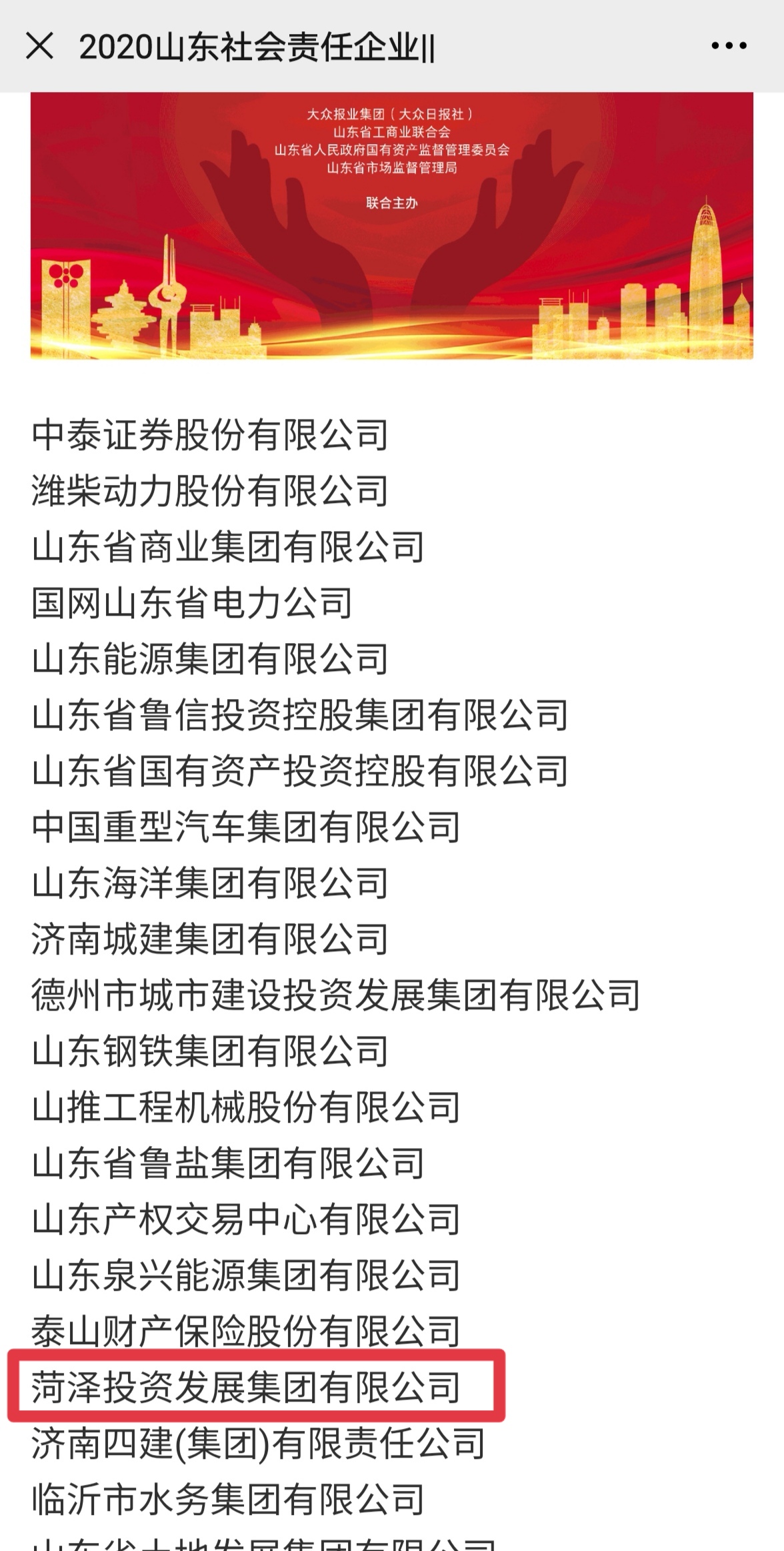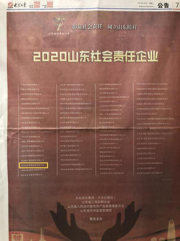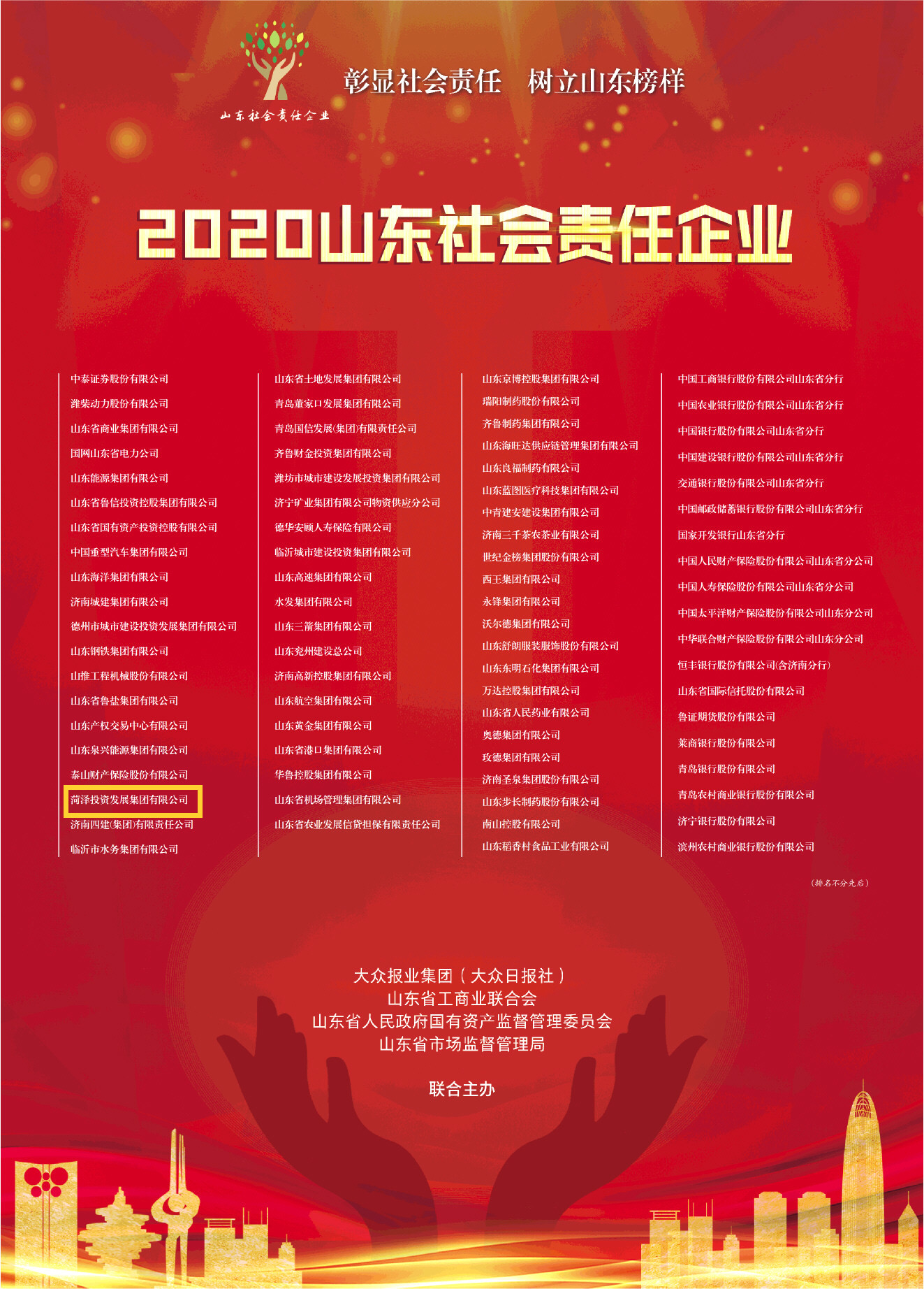 菏投集團公司榮獲“2020山東社會責任企業(yè)”,該推選活動由大眾報業(yè)集團(大眾日報社)、山東省工商業(yè)聯(lián)合會、山東省人民政府國有資產(chǎn)監(jiān)督管理委員會和山東省市場監(jiān)督管理局聯(lián)合主辦。推選活動自9月1日啟動以來,得到了社會各界的積極響應,全省共有國有、民營及金融三大序列的457家企業(yè)報名參與。經(jīng)過投票和專家評審,最終有 80家企業(yè)躋身“2020山東社會責任企業(yè)”榜單,現(xiàn)名單已在2021年1月5日大眾日報第七版刊出。