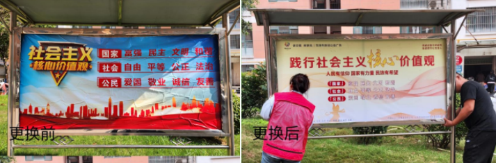 經(jīng)過前期開展的老舊、破損公益廣告全面排查,針對小區(qū)主次干道、廣場、宣傳欄等長期裸露在外、因風(fēng)吹日曬等原因造成褪色、破損、殘缺的公益廣告進(jìn)行“全覆蓋”提檔升級。此次提綱升級公益廣告牌共計18塊,并對墻面、電線桿上野廣告、“牛皮癬”進(jìn)行了清除。