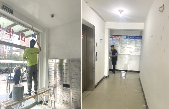 為做好社區(qū)樓道亮化凈化,逐一對每個單元樓道進(jìn)行打掃清理。針對小區(qū)單元樓一樓墻面有明顯涂劃痕跡和大面積脫落的情況,粉刷匠先拿刷子認(rèn)真清理掉墻面上的灰塵,再用滾筒蘸著涂料粉刷有劃痕和脫落的墻面,并多次粉刷印有小廣告的地方。