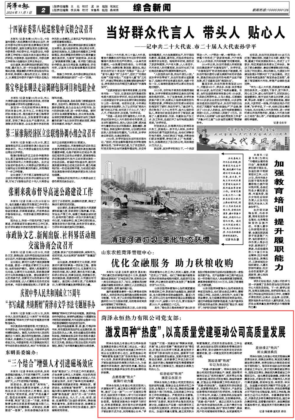 菏澤日?qǐng)?bào)刊發(fā):《菏澤永恒熱力有限公司黨支部:激發(fā)四種“熱度”,以高質(zhì)量黨建驅(qū)動(dòng)公司高質(zhì)量發(fā)展》