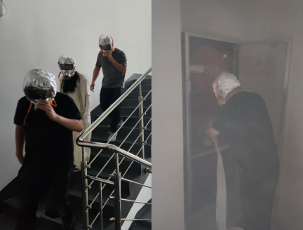 在演練活動(dòng)現(xiàn)場(chǎng),模擬8樓衛(wèi)生間處突發(fā)火災(zāi),集團(tuán)各樓層各部室隨即啟動(dòng)應(yīng)急預(yù)案,撲救組按動(dòng)火災(zāi)警鈴并進(jìn)行撲救,疏散組進(jìn)行引導(dǎo)疏散。員工在疏散過(guò)程中,彎腰低頭,用消防自救呼吸器或濕毛巾捂住口鼻,快速有序地從安全通道疏散樓梯向底層進(jìn)行撤離,最終撤離至辦公大樓前的安全地帶并進(jìn)行人數(shù)清點(diǎn)。