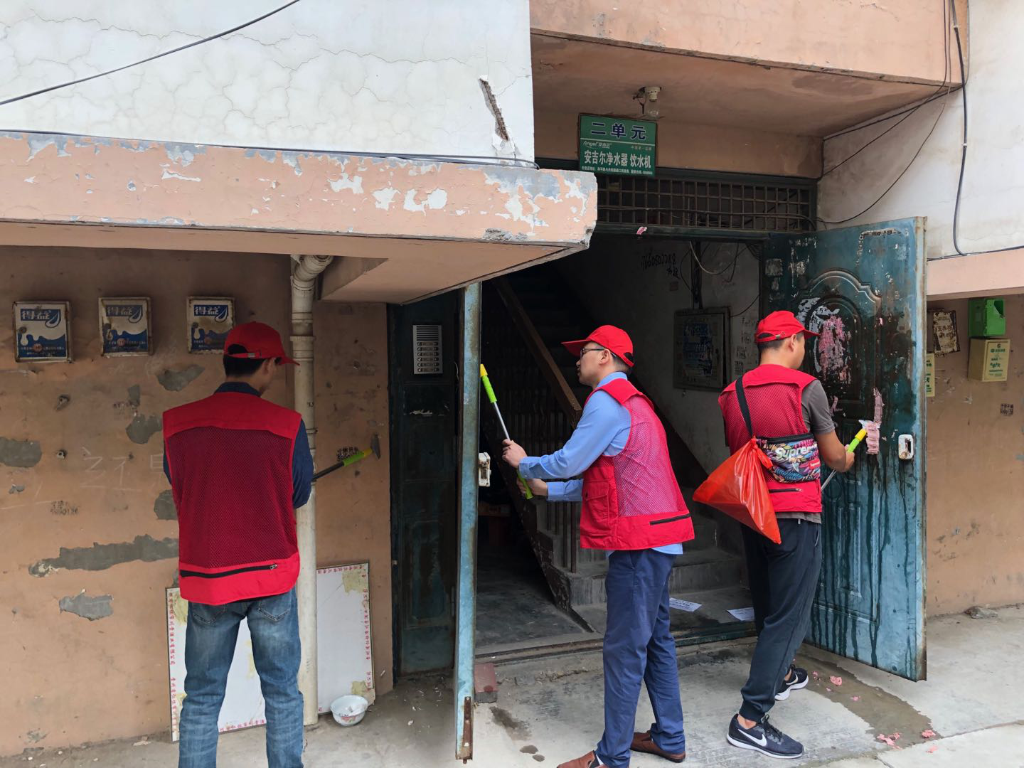 菏投集團(tuán)志愿者們仔細(xì)鏟除小區(qū)內(nèi)墻面上的小廣告
