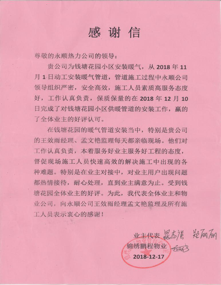 12月18日,公司收到錢塘花園業(yè)主代表及物業(yè)的感謝信,對(duì)我公司在錢塘花園小區(qū)熱力管網(wǎng)改造施工過(guò)程中認(rèn)真負(fù)責(zé)、熱情周到的工作態(tài)度給予充分肯定和大力贊揚(yáng)。