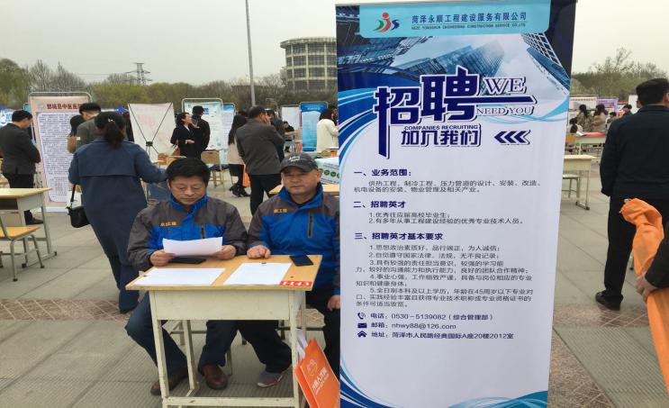 為深入貫徹落實(shí)山東省招商引資招才引智工作會議精神和菏澤市委市政府招才引智重大部署、舉措,深入推進(jìn)人才發(fā)展體制機(jī)制改革,培育公司發(fā)展新動(dòng)力,按照永順公司招才引智工作方案,3月29日,永順工程公司參加了“2019菏澤市人才大集”活動(dòng),招賢納士。