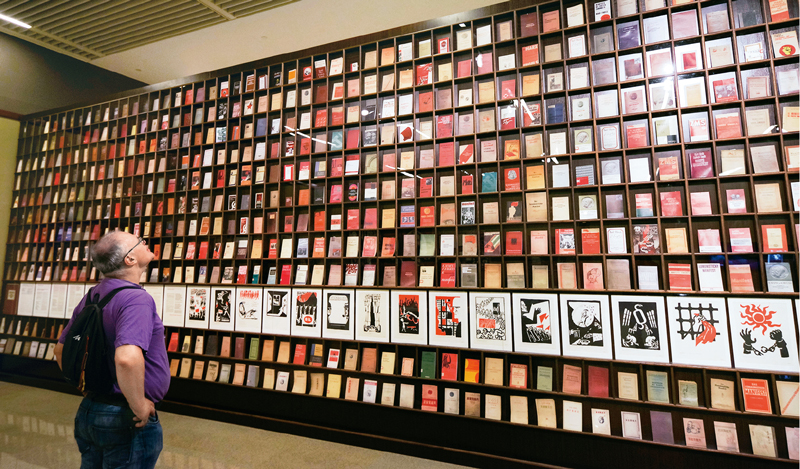 2018年5月9日,一位外國觀眾被北京“真理的力量——紀(jì)念馬克思誕辰200周年主題展覽”中一面展示不同國家出版的500多種《共產(chǎn)黨宣言》的書墻所吸引。
