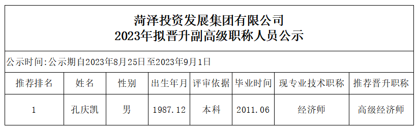 菏澤投資發(fā)展集團(tuán)有限公司2023年擬晉升副高級職稱人員公示