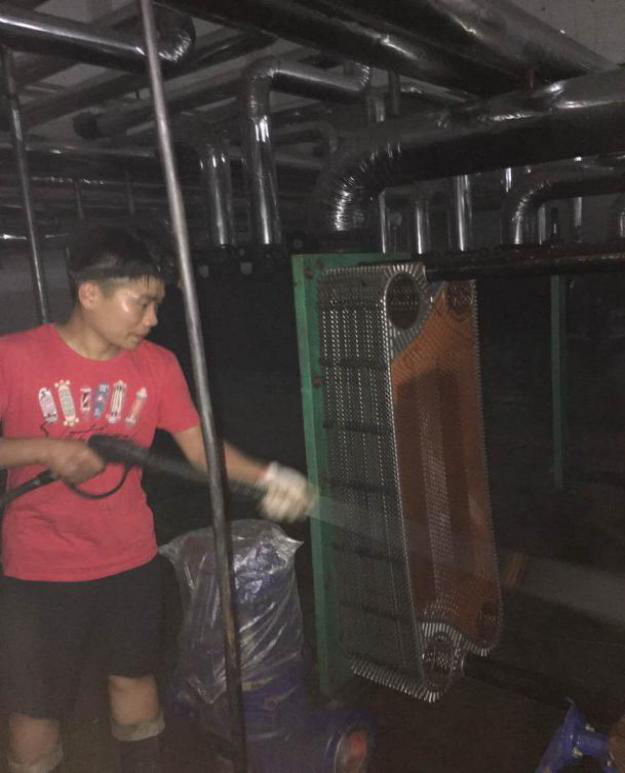 在6月份至7月上旬,隨著下個供暖的不斷臨近,換熱器作為整個供熱循環(huán)系統(tǒng)中必不可少的一個環(huán)節(jié),小區(qū)換熱器換熱能力的好壞直接決定了整個小區(qū)的取暖效果,也就決定了千家萬戶的取暖質(zhì)量。為有效改善轄區(qū)內(nèi)各小區(qū)換熱器小區(qū)的取暖效果,工作人員會在前期綜合研判的情況下對相關(guān)換熱器進(jìn)行清洗作業(yè)。雖然清洗換熱器是一個體力消耗巨大、又臟又苦的難活、累活,但是永恒熱力人對困難并沒有絲毫妥協(xié),面對清洗過程中,換熱片會逐漸干燥、脫水導(dǎo)致難以沖洗,為避免此問題,必須加班加點進(jìn)行清洗,直至清洗完畢。